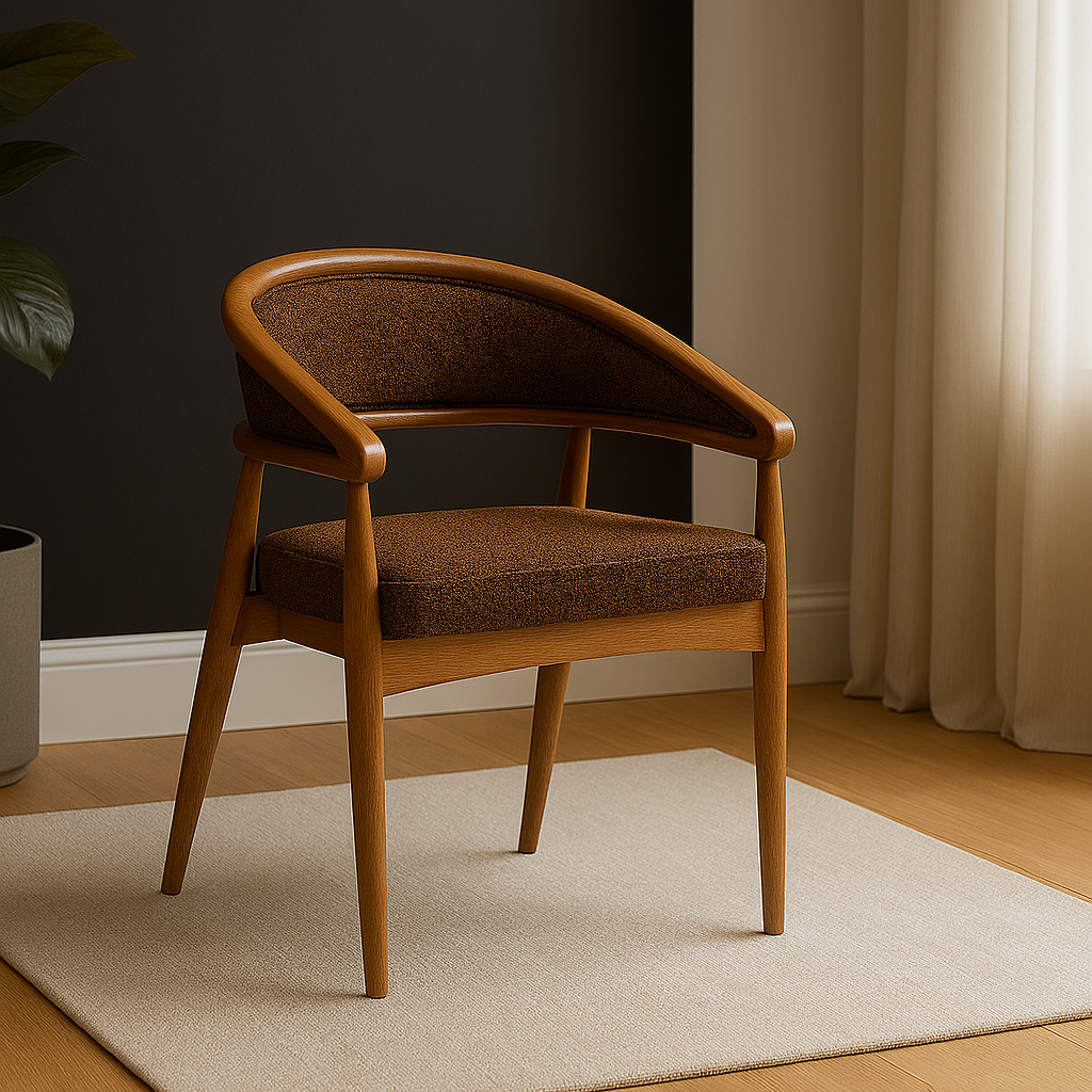 Дизайн: вдохновлён эстетикой середины XX века, с плавными линиями, изогнутой спинкой и интегрированными подлокотниками, создающими цельную скульптурную форму.