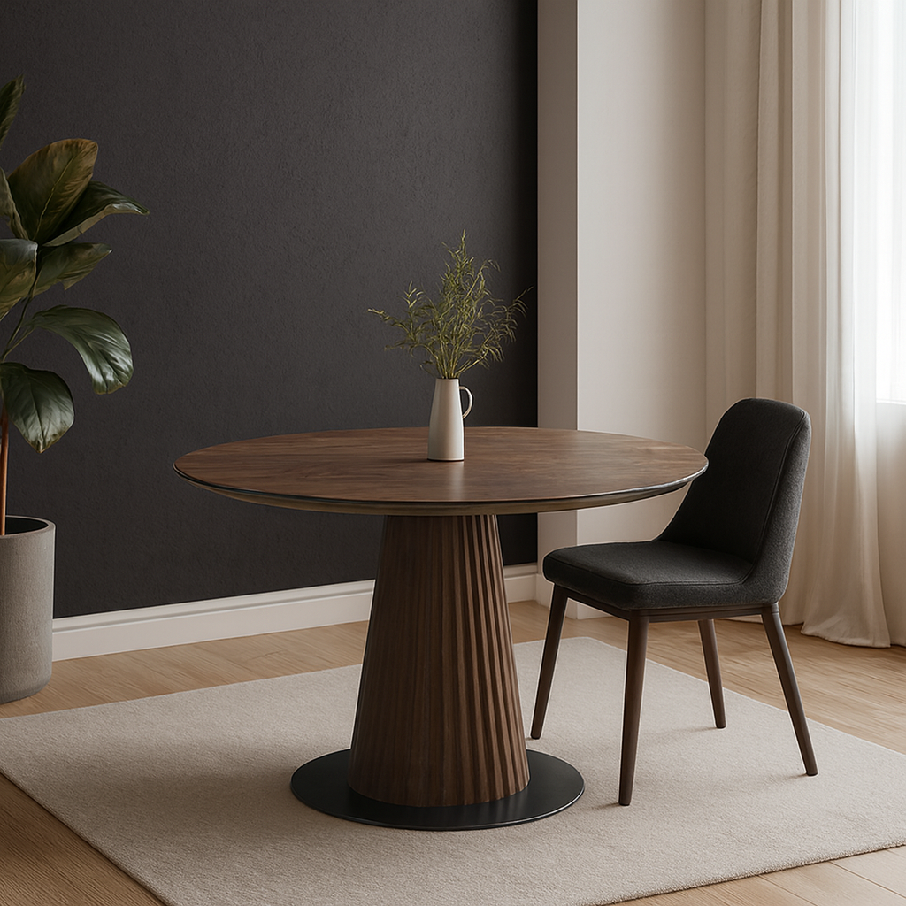 Стол «Антонио» — это воплощение современной эстетики с акцентом на натуральные материалы и архитектурную выразительность. Его круглая столешница выполнена из высококачественного шпона, подчёркивающего природную текстуру древесины и создающего ощущение тепла и уюта. Легкий сатиновый финиш придаёт поверхности глубину и мягкий блеск.Главный акцент — фланцевая ножка, собранная из вертикальных реек массива, образующих скульптурную форму. Такая конструкция не только визуально лёгкая, но и надёжная, создающая эффект архитектурной колонны. Ножка опирается на утяжелённое основание, обеспечивающее устойчивость и подчёркивающее контраст между материалами.