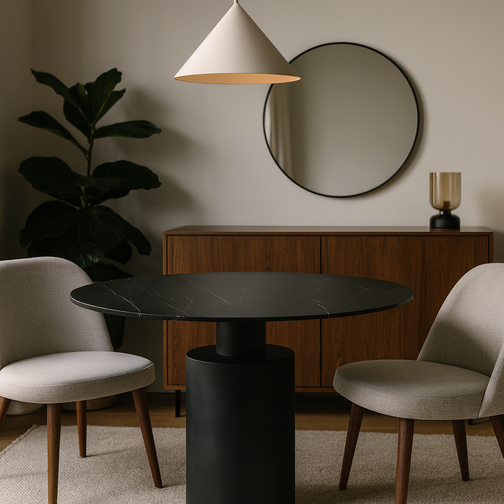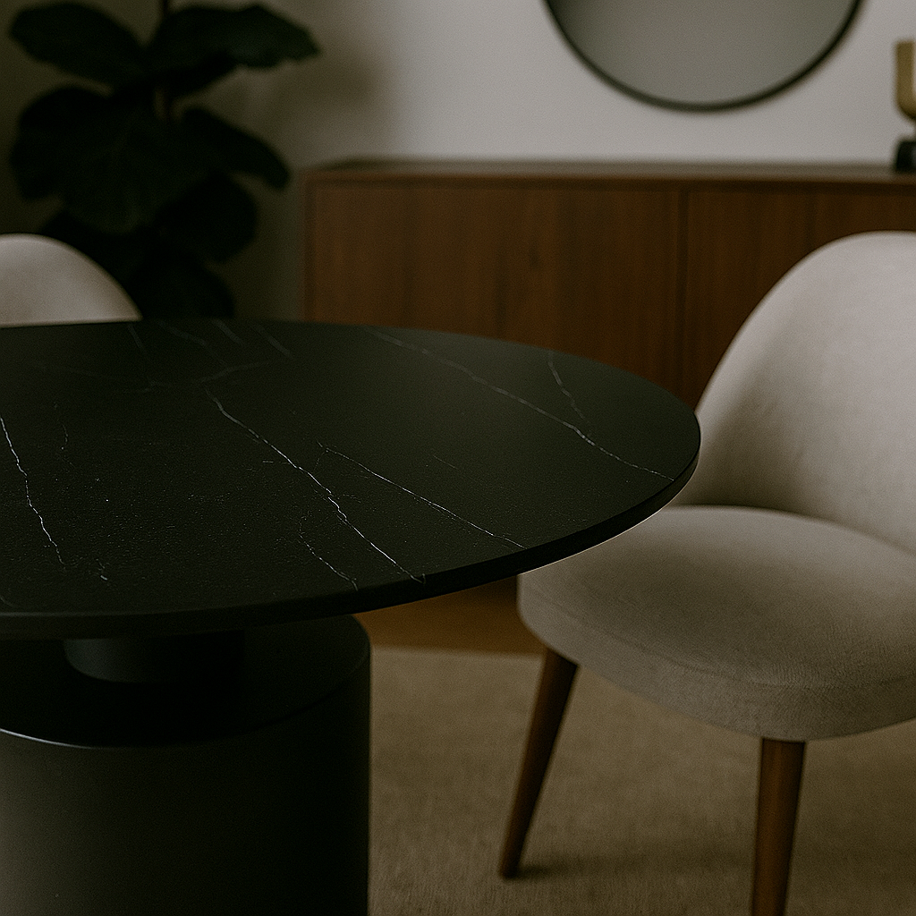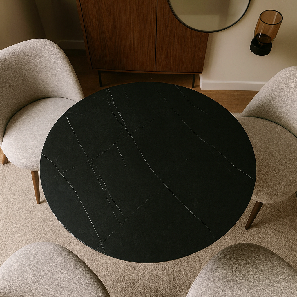 Стол Франческо — воплощение современной эстетики и утончённого вкуса. Его круглая столешница из керамогранита поражает глубиной цвета и выразительной текстурой, имитирующей природный камень. Белые прожилки на чёрной поверхности создают эффект мрамора, добавляя интерьеру нотку роскоши.
