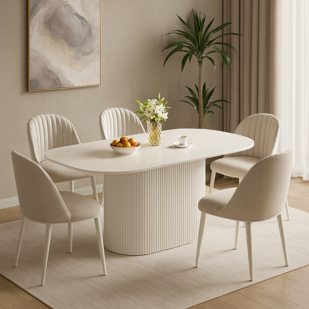 Измир — это воплощение утончённого вкуса и архитектурной строгости. Его овальная столешница, покрытая высококачественной эмалью, излучает мягкий блеск и подчёркивает чистоту форм. Центральная ножка из рифлёного МДФ, также выполненная в эмали, придаёт столу скульптурную выразительность и устойчивость, превращая его в акцентный элемент интерьера.