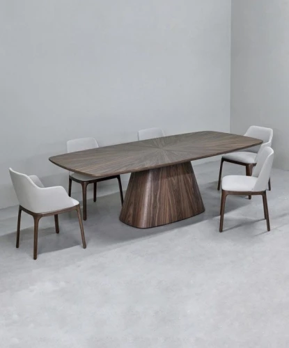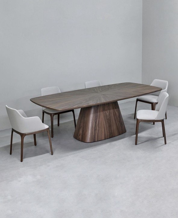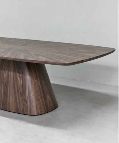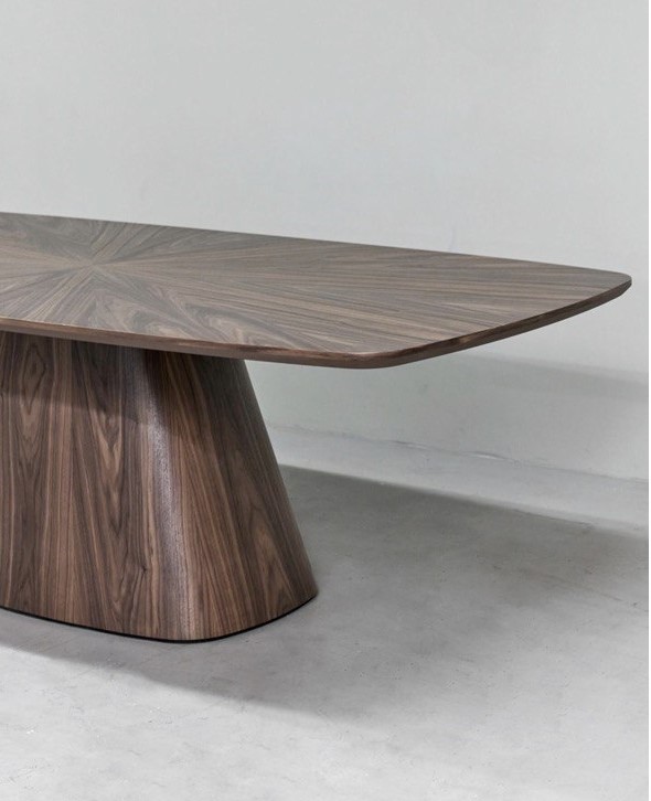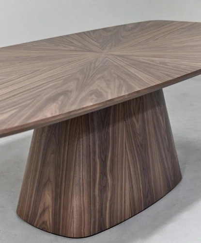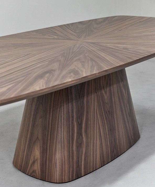 Элегантный и выразительный стол «Измир Конус» — это воплощение современного дизайна с акцентом на натуральные материалы и геометрию. Полностью выполненный из шпона, он демонстрирует богатую текстуру древесины, раскрывающуюся в виде радиального узора, который словно струится от центра к краям.