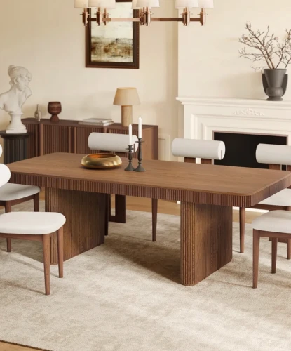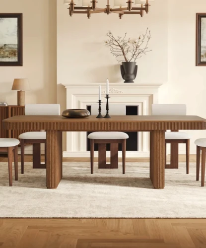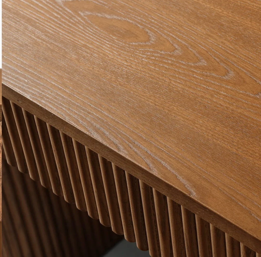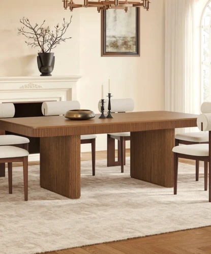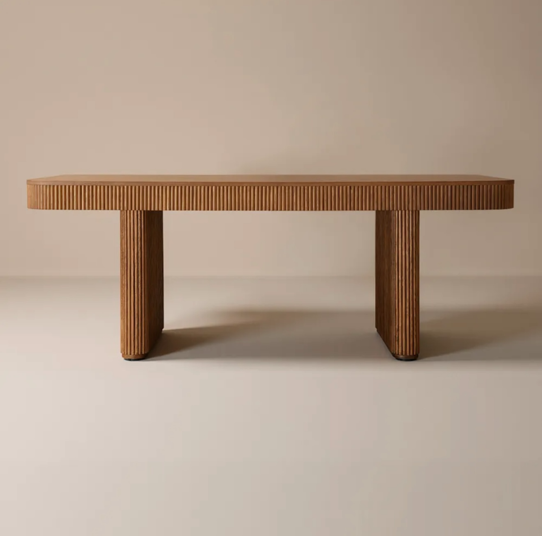 Стол «Микеле» — это воплощение современного минимализма с акцентом на текстуру и натуральные материалы. Его столешница выполнена из высококачественного шпона, подчёркивающего природную красоту древесины и создающего гладкую, тёплую поверхность. Основание — массивные ножки из вертикальных реек — придают столу архитектурную выразительность и визуальную глубину.