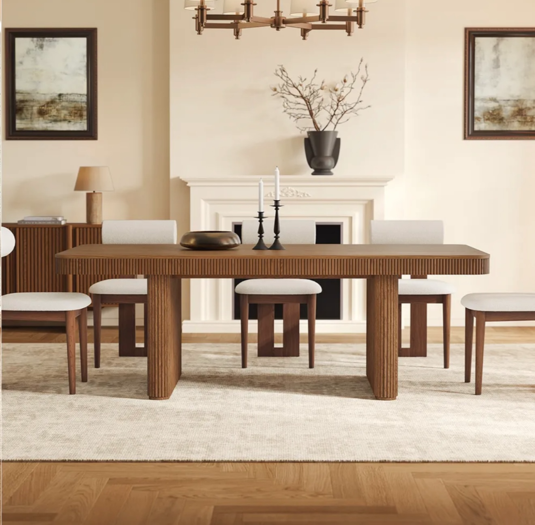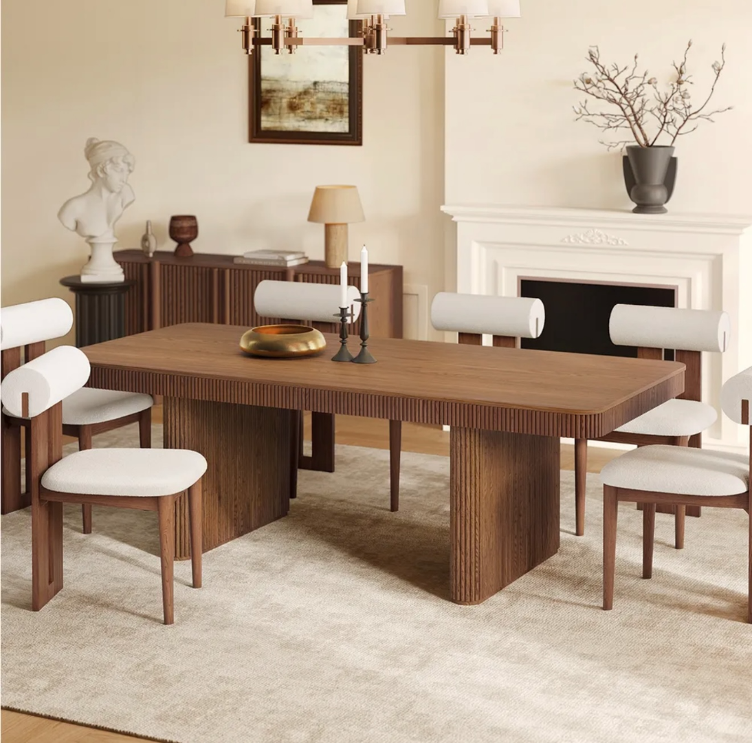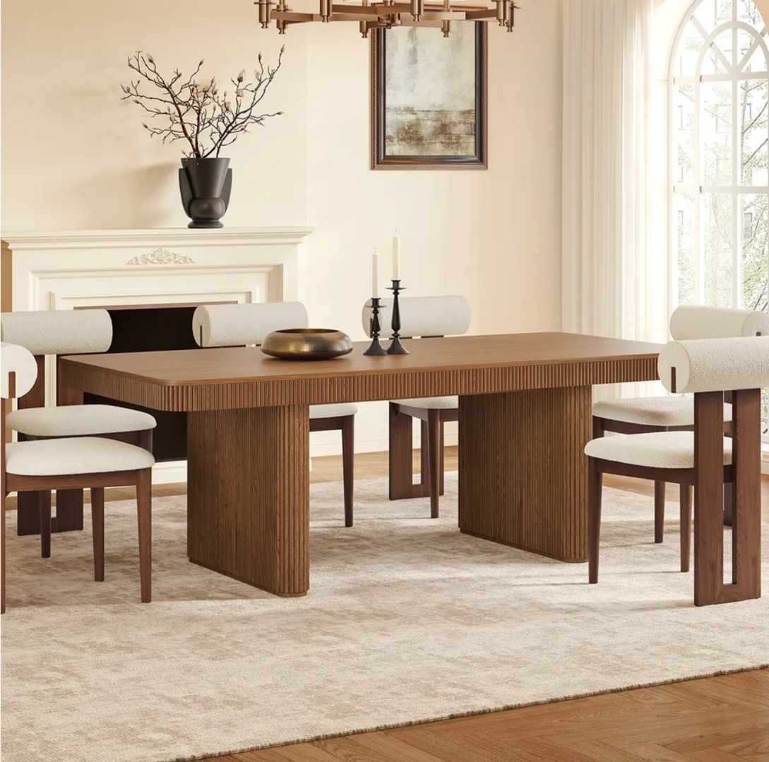 Стол «Микеле» — это воплощение современного минимализма с акцентом на текстуру и натуральные материалы. Его столешница выполнена из высококачественного шпона, подчёркивающего природную красоту древесины и создающего гладкую, тёплую поверхность. Основание — массивные ножки из вертикальных реек — придают столу архитектурную выразительность и визуальную глубину.