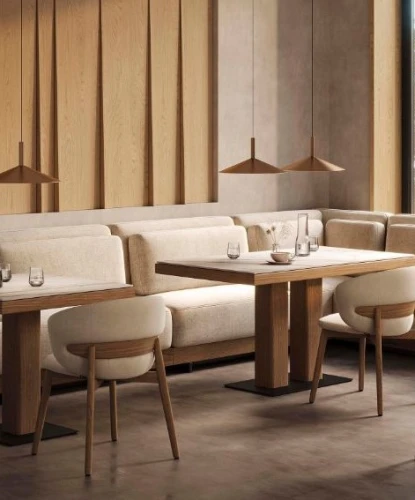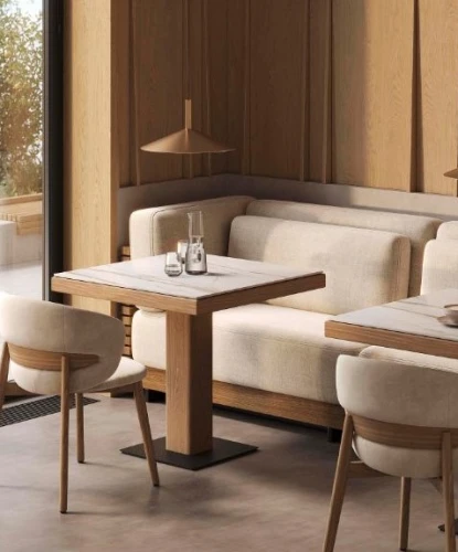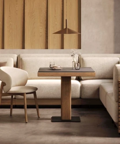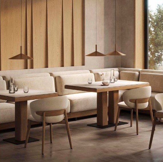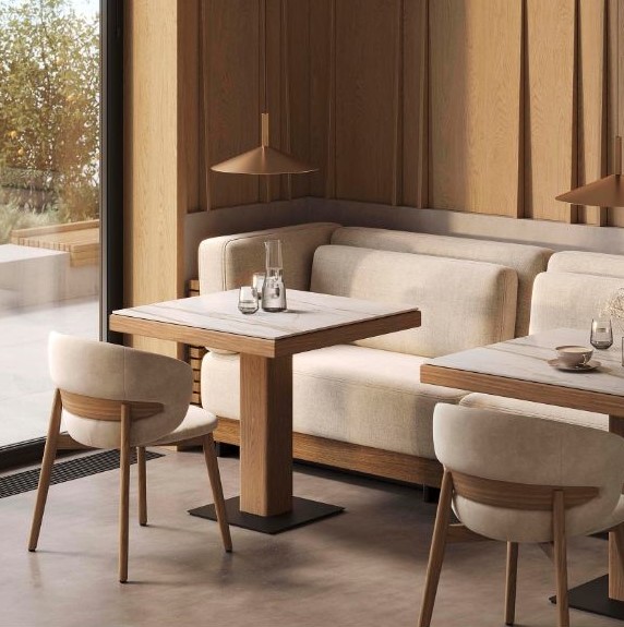Цветовая палитра: нейтральные природные оттенки — светлый древесный каркас и керамогранит в тёплом серо-бежевом тоне — легко сочетаются с пастельной мебелью и акцентными стенами.