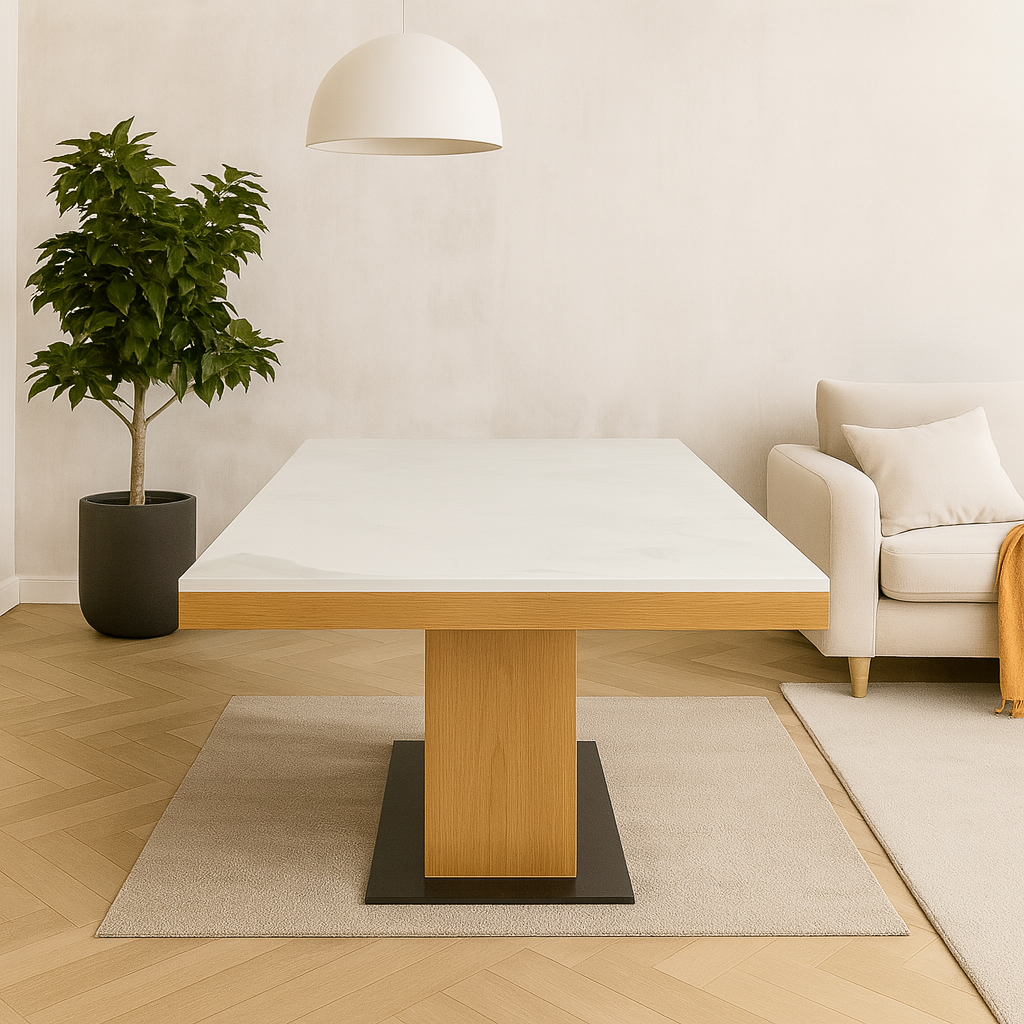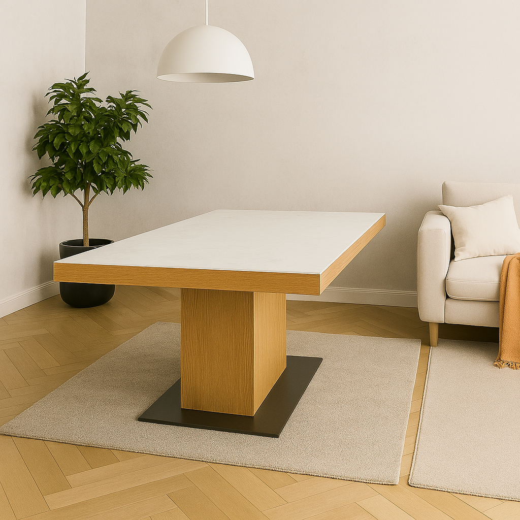 Опора — две массивные вертикальные ножки, облицованные натуральным шпоном. Тёплая текстура дерева контрастирует с холодной поверхностью столешницы, создавая сбалансированный диалог между природным и индустриальным.